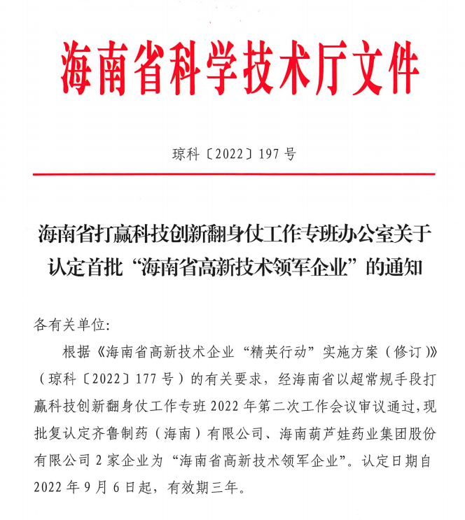 近日,海南省科学技术厅发布的《海南省打赢科技创新翻身仗工作专班办公室关于认定首批“海南省高新技术领军企业”的通知》中显示,批复认定海南AG贵宾药业集团股份有限公司等2家企业为“海南省高新技术领军企业”。认定日期自2022年9月6日起,有效期三年。