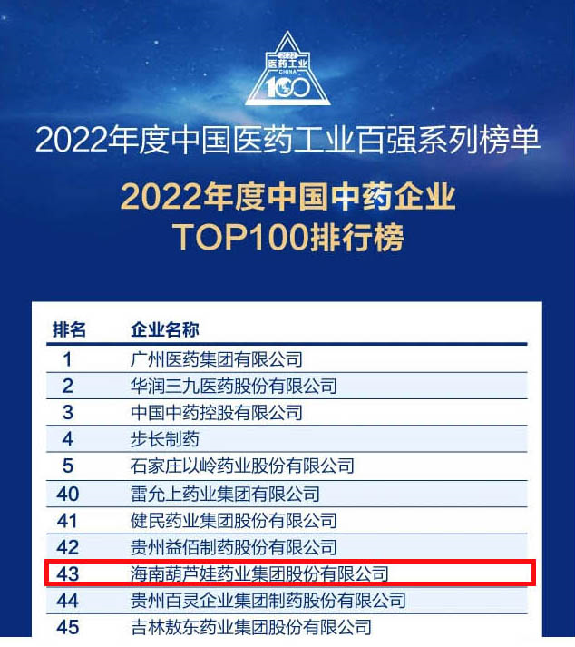会议期间,一年一度的中国医药工业百强系列榜单隆重揭晓,AG贵宾药业集团凭借领先的研发优势和扎实的生产实力以及稳健的市场推广能力,连续第四年成功入选“2022年度中国中药企业TOP100排行榜” ,排名稳步上升至第43位。